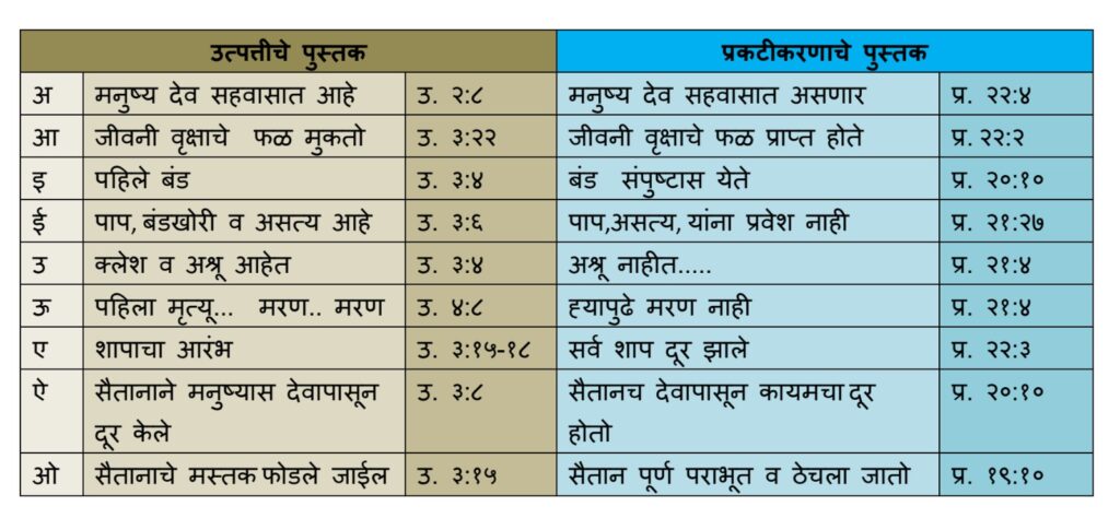 उत्पत्ती हे पवित्र शास्त्रातील पहिले पुस्तक असून प्रकटीकरण हे शेवटले पुस्तक आहे. उत्पत्तीचे पुस्तक ते प्रकटीकरणाचे पुस्तक ही पूर्णत्वाकडे वाटचाल आहे.